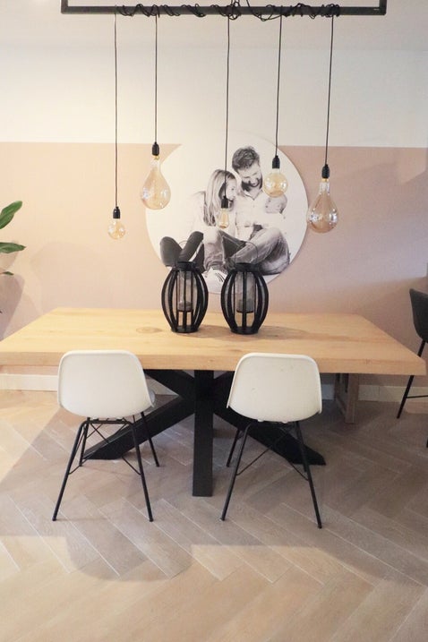 Om het geheel af te maken en de warme tinten van de stoelen terug te laten komen, heb ik gekozen voor andere decoratie.