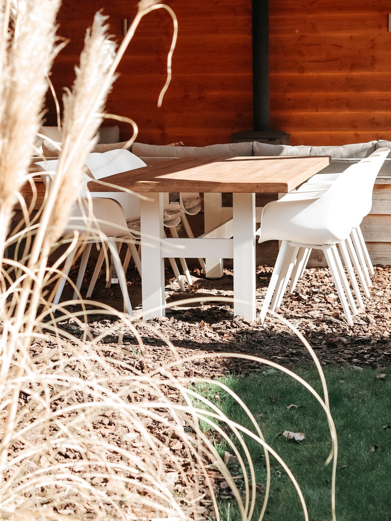 De mooie, grote veranda zal blijven. Hier hebben we gekozen voor een zit- en loungegedeelte. Een heerlijke grote tafel, die ruimte biedt voor de hele familie en goed te onderhouden is, was onze wens. Wij hebben gekozen voor de Yasmani tafel en Sophie stoelen van Hartman.